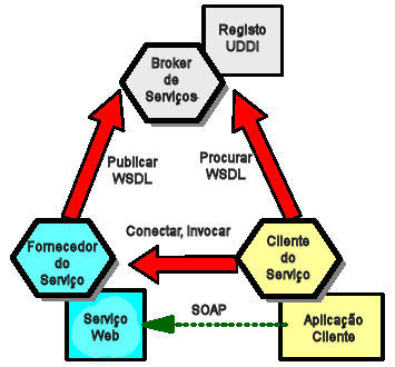 Desta forma, qualquer cliente independentemente da plataforma e da linguagem de programação em que foi desenvolvido poderá descobrir o serviço, consultar o documento WSDL e, através deste, conectar-se ao serviço, invocando-o através de mensagens formatadas segundo o protocolo SOAP.